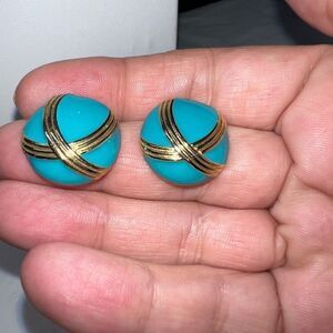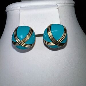 Vintage Gold Tone And Aqua Blue Enameled Earrings