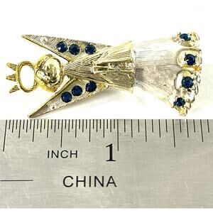 Beautiful vintage angel brooch featuring a gold-tone finish with sparkling blue rhinestone accents on the wings and hem. The angel’s halo and textured gown add a lovely touch of mid-century charm. Perfect for holiday wear or as a symbolic everyday piece.