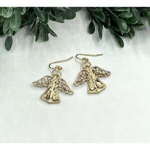 Delicate angel-shaped earrings crafted with intricate filigree detailing and a refined gold tone. These sophisticated accessories offer a timeless design that complements professional and formal attire with subtle spiritual symbolism.