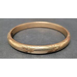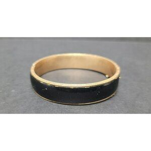 Lot of 3 vintage gold tone bangle bracelets, weighing a combined 50.3 grams. This set includes a variety of designs: one features ornate scrollwork with an oval center monogram, one with black enamel detailing, one with etched floral engravings, and a smooth polished style. Each bracelet has unique character and vintage charm, showing expected surface wear and patina from age. Clasps and hinges (where applicable) are functional.