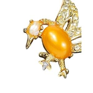 Add a touch of vintage charm to your collection with this delightful bird brooch. The piece features a bright gold-tone setting with sparkling rhinestone-encrusted wings, a smooth amber-colored cabochon body, and a pearl-style bead head. Detailed feet and beak complete the whimsical design, making it a fun and stylish accessory for any outfit.