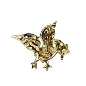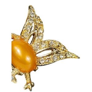 Vintage Gold Tone Bird Brooch with Amber Cabochon & Rhinestone Wings – Retro...