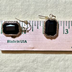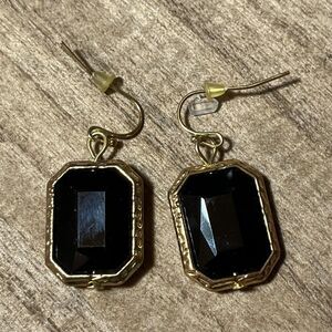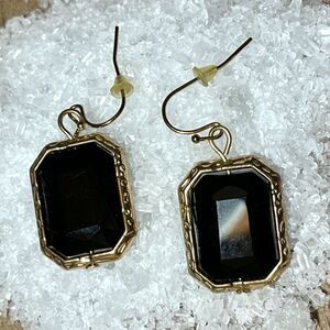 Vintage Gold Tone Black Glass Emerald Cut Hook Earrings
