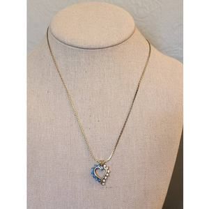 Vintage Gold Tone Blue and Clear Stone Open Heart Pendant on Gold Tone 17" Chain
