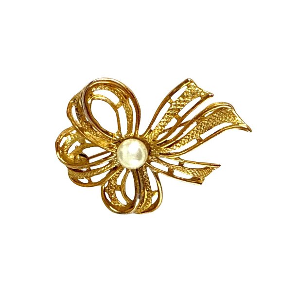 This beautifully detailed vintage brooch features an openwork gold-tone bow design centered around a luminous faux pearl. Measuring approximately 2.25 inches in height, this feminine pin adds a timeless accent to coats, scarves, blouses, and hats. A perfect find for vintage jewelry collectors or anyone seeking a classic statement piece.