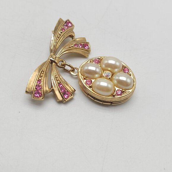 This vintage brooch combines elegance with functionality, featuring a locket adorned with faux pearls and pink rhinestones, all set in a gold tone finish. The unique bow design adds an extra touch of sophistication, making it an exquisite accessory to enhance any attire.