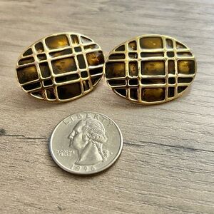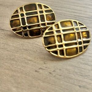 Make a bold, stylish statement with these unique vintage clip-on earrings. Featuring a striking geometric design, these earrings showcase a rich, dark brown enamel set within a polished gold-tone frame. The oval shape and grid pattern give them a retro yet timeless appeal, perfect for adding a touch of sophistication to any outfit. They are a great find for anyone who loves vintage accessories or appreciates a classic, elegant look.