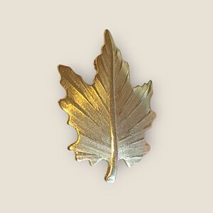 This vintage gold tone brooch features a beautifully brushed textured maple leaf design, perfect for any occasion such as Mother's Day, anniversary, or birthday. The brooch is a stunning piece of jewelry that will complement any outfit, and its unique design is sure to catch the eye of any fashion-conscious woman. The brooch is made of high-quality materials, although the specific materials and metal purity are unknown. The vintage piece is a timeless beauty, and its textured design is perfect for those who appreciate nature and flowers & plants. This brooch is a must-have for any fashion jewelry collection.