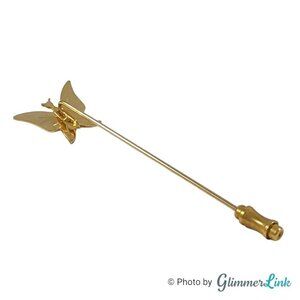 Vintage gold tone stick pin featuring a butterfly shape with etched details and a shiny polished finish.