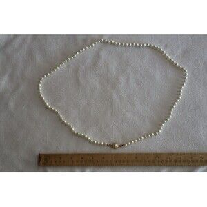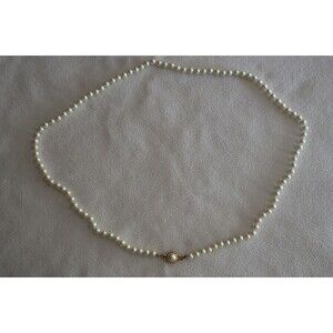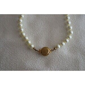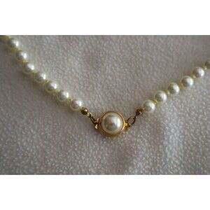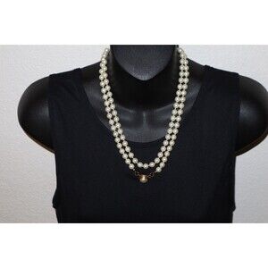 Vintage Gold Tone Cabochon Clasp Faux Pearl Hand Knotted Beads Necklace 40"