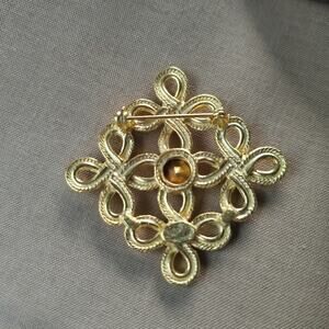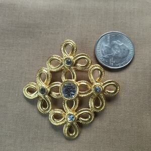 Vintage Gold Tone Celtic Style Scroll Twisted Cross Brooch with Clear Rhinestones. Nice piece with a matte gold colored finish. Large clear rhinestone in the center with four smaller rhinestones in the outer crosses. Pre-owned excellent condition. From a non-smoking home. Quarter is for size reference only and is not included in the listing. Not branded.