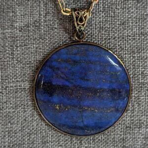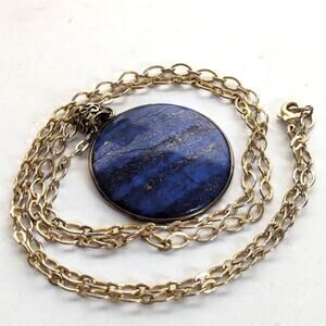 Vintage Gold Tone Chain Chunky Large Lapis Lazuli Boho Pendant Necklace