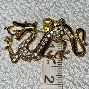 Vintage gold-toned brooch in the shape of a Chinese dragon, adorned with clear rhinestones and a green stone eye.