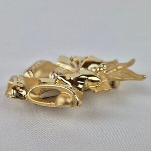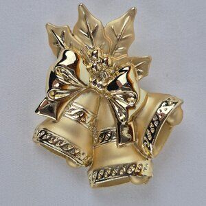 Vintage Gold Tone Christmas Holiday Brooch with Bells, Holly and a Bow Design. Festive arrangement of bells, holly leaves and a decorative bow all in a gold tone finish. features both matte and shiny finishes for added detail. classic pin back closure. Add a touch of sparkly holiday cheer to your outfit. Preowned- the pin has a little wear. Please see picture or approximate measurements. Christmas, holidays, vintage, Art Deco style, statement piece.