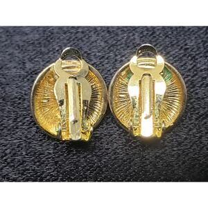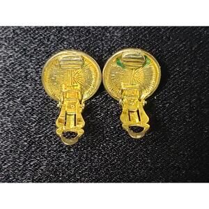 Vintage Gold Tone Circle Black Button Clip on Earrings. Preloved condition, one of the earrings does have some green coloring on the inside as shown.