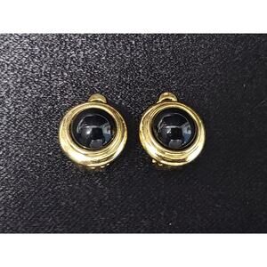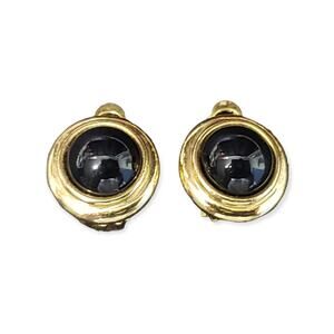 Vintage Gold Tone Circle Black Button Clip on Earrings