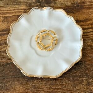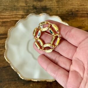 Vintage gold-tone brooch featuring an elegant circular openwork design, resembling interlocking links. This classic and versatile piece measures just under 2” in diameter and is in excellent condition. A timeless accessory that adds a touch of sophistication to any outfit, perfect for vintage jewelry collectors or as a thoughtful gift.