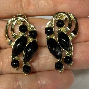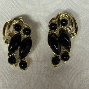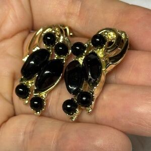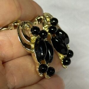 Vintage Gold Tone Clip Earrings With Black Agate And Acrylic Beads