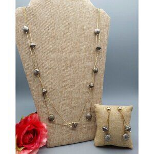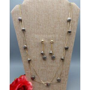 Vintage Gold Tone Cobra Chain Double Strand Necklace & Dangle Pierced Earrings Set Silver Tone Unique Bead Stations