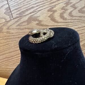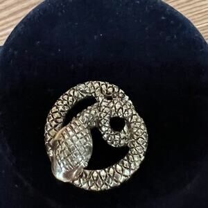 Vintage gold tone coiled snake brooch/ lapel pin, midcentury modern style, no markings, textured pattern.