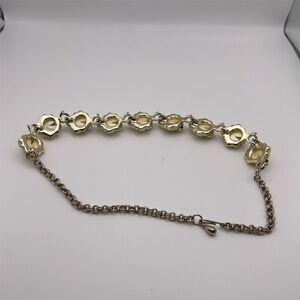 Keywords: vintage beaded necklace, gold-tone jewelry, floral theme necklace, women's fashion jewelry, anniversary gift necklace, cream-colored beads, vintage fashion accessory, pre-owned jewelry, gold beaded necklace, floral design necklace, women's vintage necklace, gold and cream necklace.