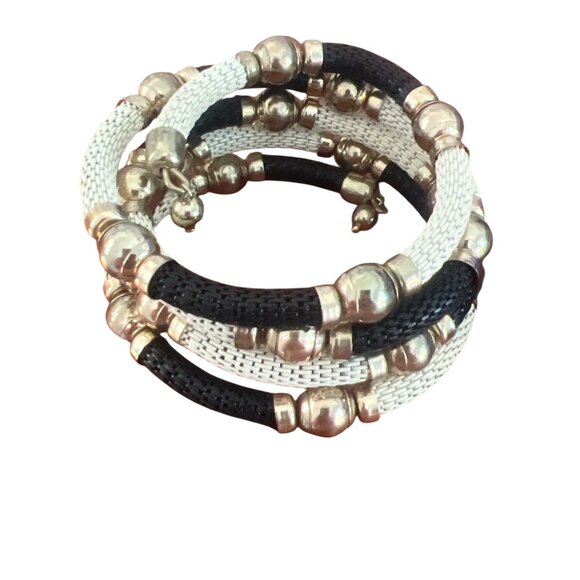 This vintage gold tone bracelet features a cream and black mesh design on memory wire, making it adjustable for a comfortable fit. Perfect for adding a touch of elegance to any outfit.