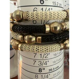 Vintage Gold Tone Cream Black Mesh Memory Wire Bracelet Cuff Adj Estate READ