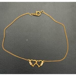 Vintage Gold Tone Dainty Simple Two Hearts With Clear Rhinestones 9 Inch Anklet