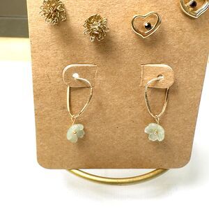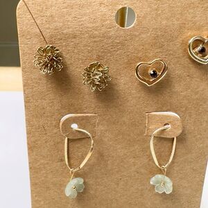 Vintage 3 Pair Gold Tone Pierced Earrings Heart and Garnet, Blue/Green Flower Dangle, Dandelion Posts