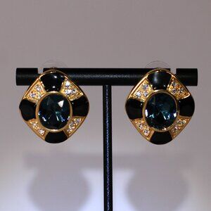 Vintage Gold Tone Earrings with Clear and Blue Rhinestones