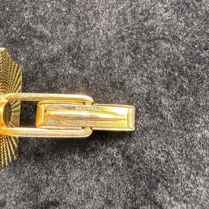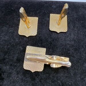 Classic vintage men’s accessory set featuring gold-tone cufflinks and a matching tie clip. Each piece is decorated with a heraldic crest design — a gold lion against a light blue background, and three gold crowns on black enamel. Perfect for collectors of mid-century men’s fashion or anyone looking to add a touch of old-school style.
