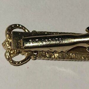 This features a gold tone with mother of pearl inlaid and a deep orange color rhinestone - perfect for fall