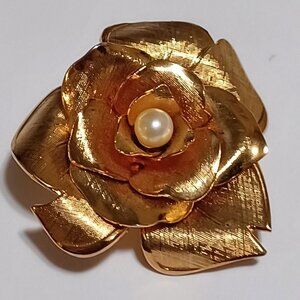 Vintage Gold Tone Faux Pearl Rose Flower Brooch Pin