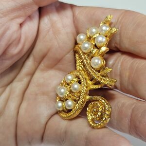 This vintage gold tone faux pearl wheel barrel of flowers pin brooch features a classic design with a touch of elegance. Made from mixed materials, it showcases imitation pearls and vintage charm. Perfect for adding a touch of sophistication to any outfit, this brooch is a timeless accessory that will elevate your style with its unique and eye-catching design.