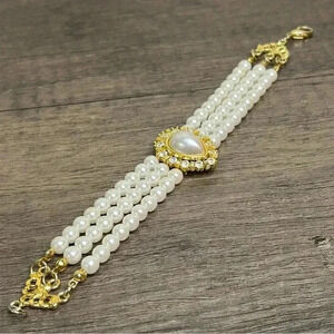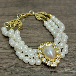 Vintage Gold Tone Faux Pearls and Crystals Three Strand and Pendant Bracelet
