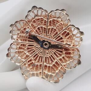 Vintage Gold Tone Filigree Brooch with Red Rhinestones 1.75" Floral