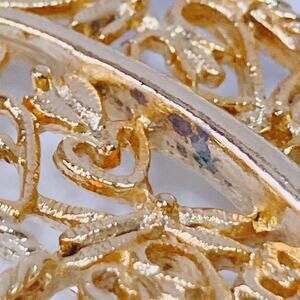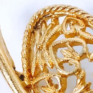 Features: Fluid leaf design; openwork filigree construction; rope-edge border; rollover safety clasp; rich gold tone finish