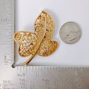 Vintage Gold Tone Filigree Leaf Butterfly Brooch Mid Century Delicate Jewelry