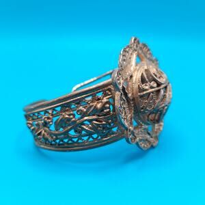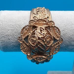 *Description: Chunky gold tone filigree openwork cuff bracelet in an Egyptian Revival style. The bracelet is 6 1/2 inches from tip to tip and then there is about 3/4 of an inch to 7/8 inch open space. The top is also open work in a framed dome design. It is a very bohemian style. This would be a great addition to your jewelry collection or make a great gift!