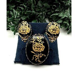A sophisticated vintage jewelry set featuring a brooch and clip-on earrings with intricate gold floral designs on black glass, perfect for collectors or elegant wear.