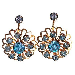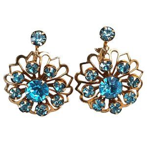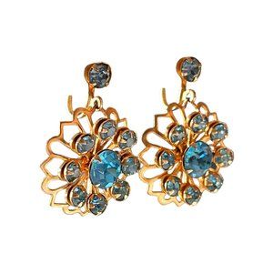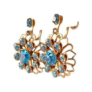 Vintage Gold Tone Floral Blue Rhinestone Dangle Screwback Earrings Not Signed
