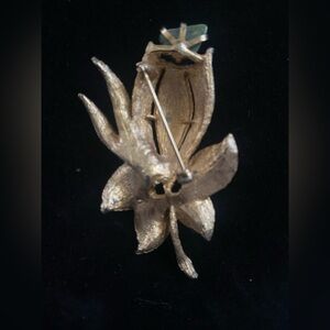 Floral brooch with detailed texture. Prongs holding stone.