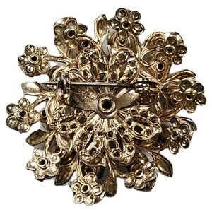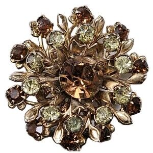 Add a touch of vintage elegance to your collection with this stunning floral brooch. Featuring a gold-tone metal base in a flowerburst design, this brooch is adorned with sparkling amber and light green rhinestones. The large faceted amber rhinestone at the center is surrounded by alternating green and brown stones, giving it a radiant, eye-catching look. Perfect for collectors of vintage costume jewelry or as a statement accessory for any outfit.
