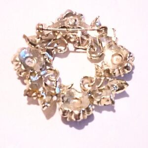 This charming Vintage Gold Tone Flower and Leaf Circle Brooch exudes timeless elegance. Crafted with a warm gold finish, the brooch features a delicate floral and leaf design, beautifully accented by sparkling cognac and clear rhinestones. Measuring 1 7/8" in diameter, it is the perfect size to add a subtle, yet eye-catching touch to any outfit. While one rhinestone appears to be missing in the picture, rest assured that it has been reset, restoring the brooch to its full, original beauty. This vintage piece is a lovely example of classic style and craftsmanship.