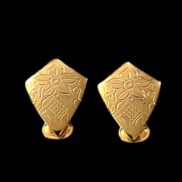 Vintage Gold Tone Geometric Engraved Floral Abstract Shield Clip On Earrings