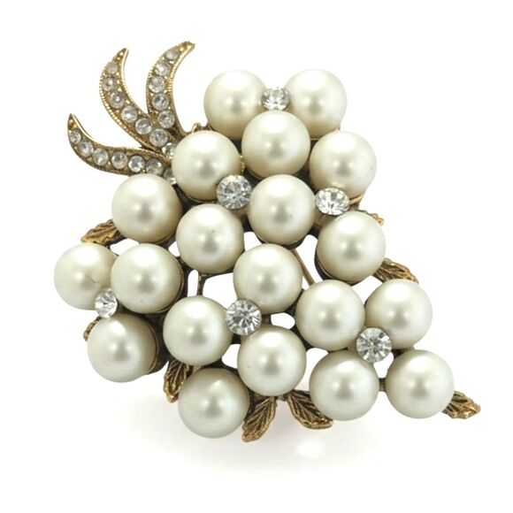 Elegant vintage brooch featuring a gold tone grape cluster design accented with faux pearls and sparkling clear rhinestones. A timeless accessory that adds a touch of vintage charm to any outfit.