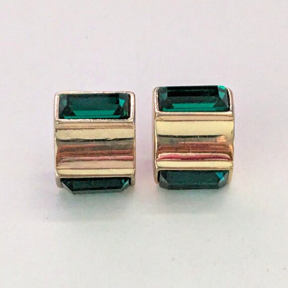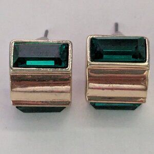 Vintage Gold Tone Green Faux Emerald Baguette Stone Pierced Stud Earrings