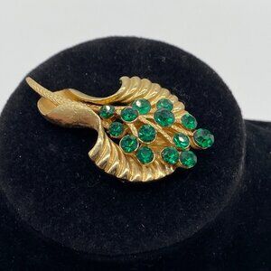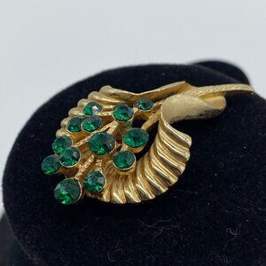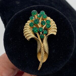 This vintage gold tone brooch pin showcases green rhinestones in an elegant floral spray design, perfect for adding a touch of classic charm to any outfit.