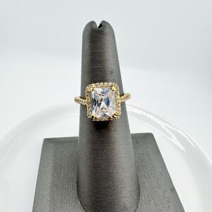 Radiant and refined, this gold-tone cocktail ring features a large square-cut clear cubic zirconia stone framed by a shimmering halo of smaller crystals. The pave-set sides add extra brilliance, catching the light beautifully with every movement. The design channels Hollywood red carpet glamour and modern bridal chic, making it a perfect piece for special occasions, engagement-inspired looks, or adding sparkle to your everyday style.