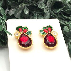 Elegant vintage earrings with a festive holly design, featuring gold plating and vibrant red and green enamel accents.